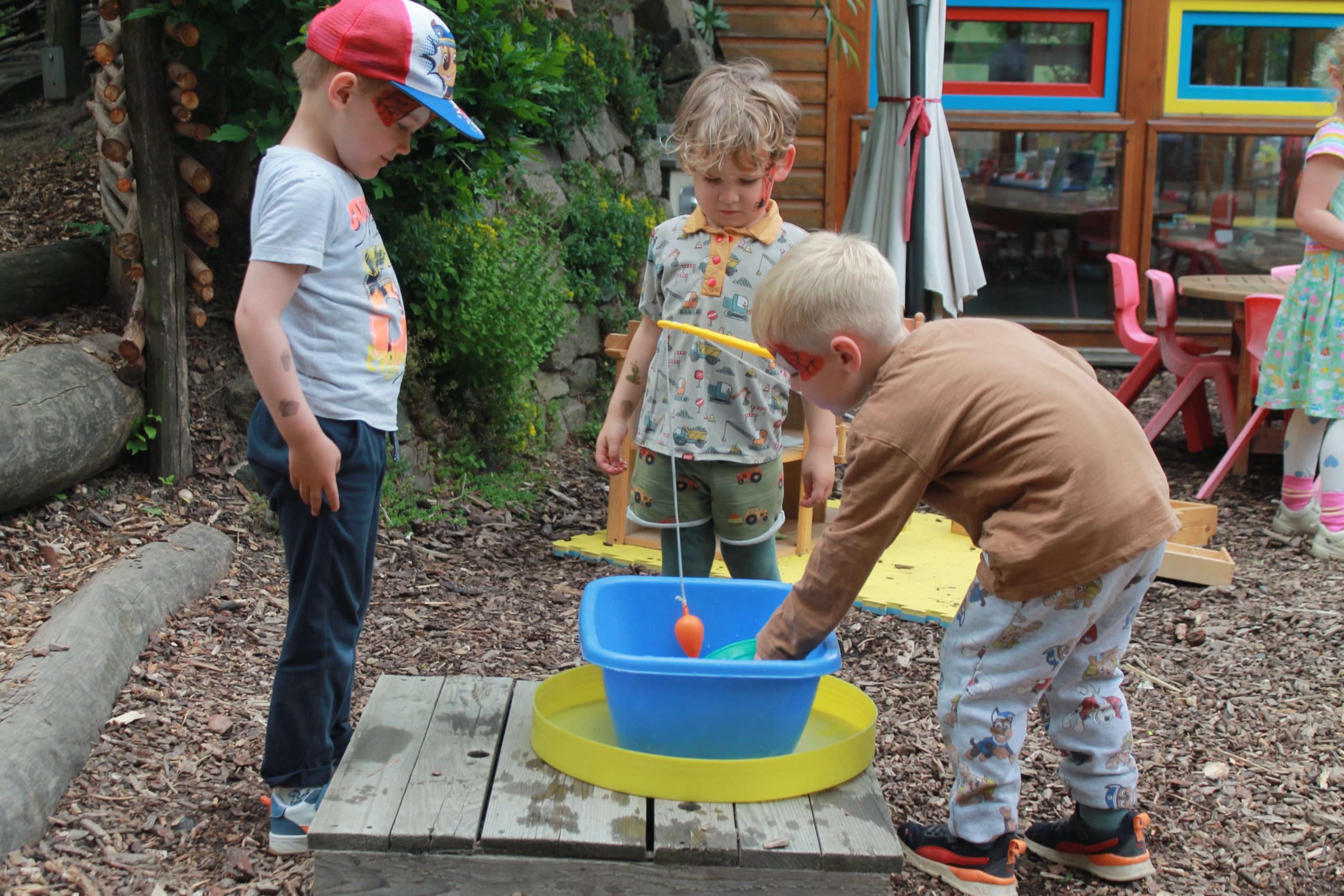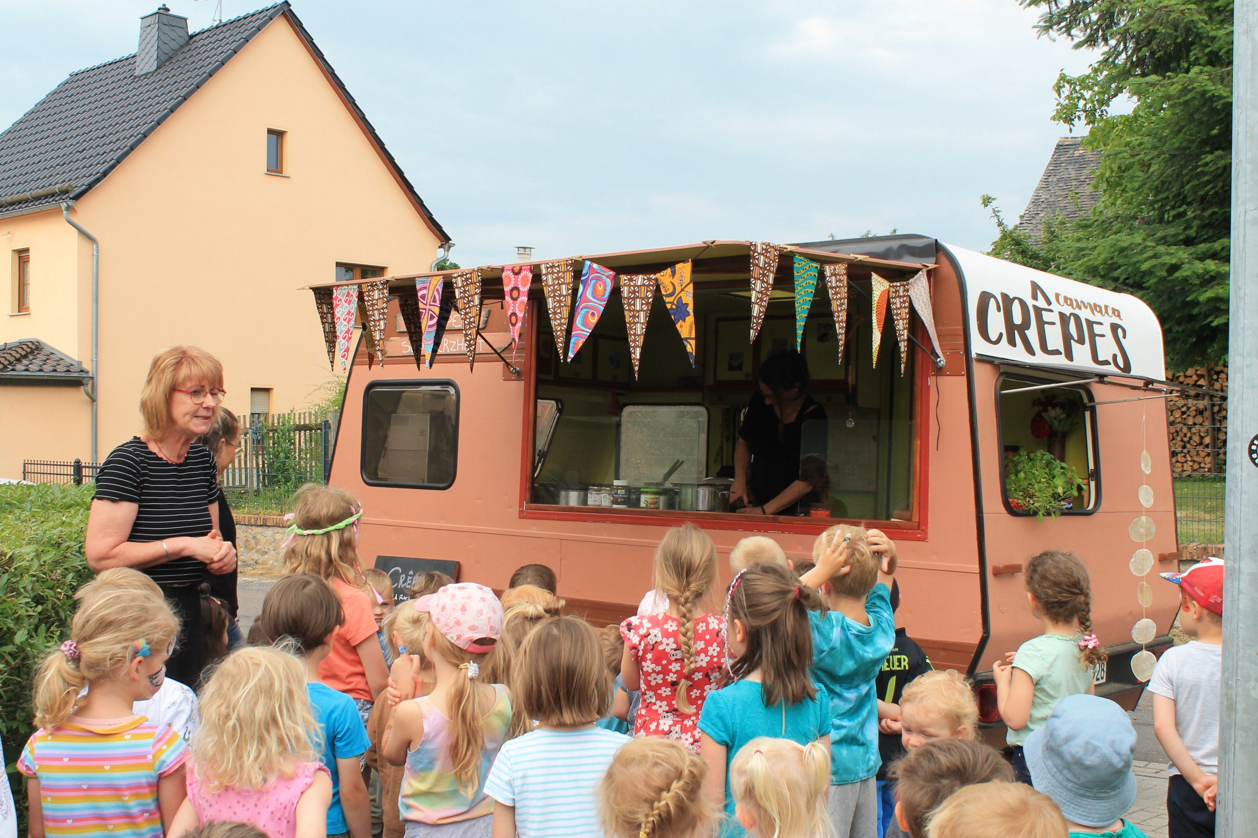 Lange überlegten wir Erzieherinnen, womit wir unseren Kindern an ihrem Ehrentag eine Freude machen könnten. Den Schlendrian hatten wir schon, den Tierpark hatten wir schon, einen selbstgebauten Eiswagen hatten wir schon, aber einen Crepes-Wagen nur für das Kinder-Lehm-Haus, das gab es noch nie. Dementsprechend begeistert waren alle Kinder und auch Erzieherinnen als dieser auf unserem Parkplatz hielt und seine Verkaufsklappe für uns öffnete. Doch zuerst mussten die Zutaten angerichtet, die Platten vorgeheizt und der Teig gequirlt werden. Also Zeit für tolle Spiele., geschminkt waren wir schon fast alle. Larissa hatte seit den frühen Morgenstunden mit viel Phantasie gearbeitet und nun konnte man bei Yvonne noch Bänder in die Haare flechten lassen. Ob beim Tor-Ball schießen, Fische angeln, Mäuse Wettlauf, Eier laufen und einiges mehr, ruck zuck verging die Zeit und bald roch es wunderbar nach frischen Crepes. Da gab es für alle kein Halten mehr. Wir schmausten und schlemmten was das Zeug hielt. Es war einfach köstlich. Das machen wir gern mal wieder.