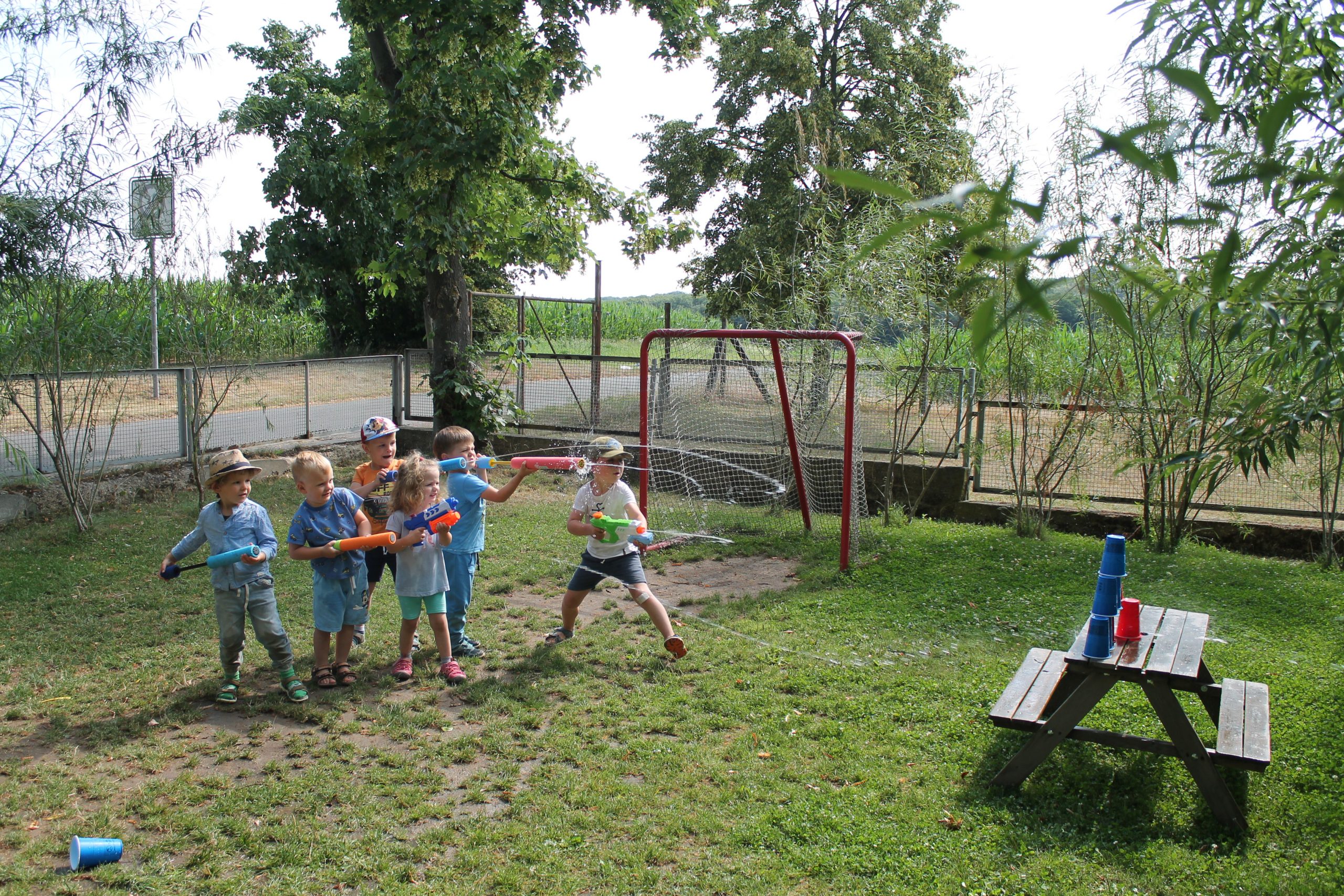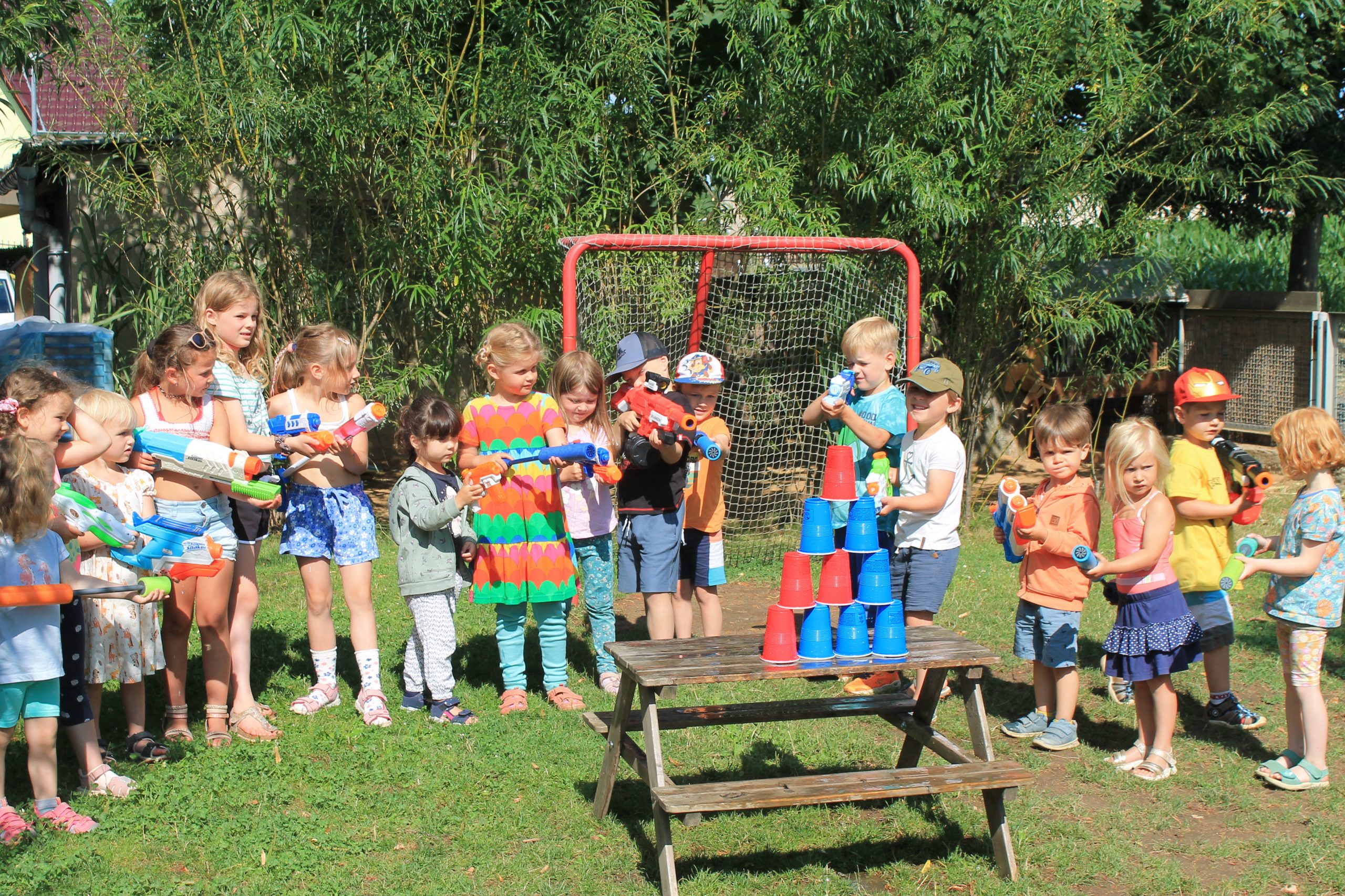 … genauso hatten wir uns das im Monat Juli vorgestellt und an manchen Tagen hat das auch gut geklappt mit dem Sommerwetter. So konnten wir zum Ende der ersten Ferienwoche alle Geburtstagskinder aus dem Monat Juni noch einmal hochleben lassen und im Rahmen einer Wasserparty kleine sportliche Wettkämpfe veranstalten. Beim Dosenwerfen, Wasserbombenlaufen und Zielen mit der Wasserspritze bewiesen unsere Kinder jede Menge Geschicklichkeit und hatten dabei mindestens genauso viel Spaß. Auf dem Programm stand außerdem Kindergartenkino mit dem „Karneval der Tiere“. Im weiteren Verlauf der Ferienzeit verbrachten die „Großen“ mal wieder einen erlebnisreichen Tag im Bahrener Wald und auch das Sterntaler Theater mit Meike Kreim stattete uns einen Besuch ab. Wieder einmal durften wir eines von Krümelchens Abenteuern miterleben, welches alle Kinder zum Zuhören und Mitmachen anregte. Mit ihren minimalistischen Requisiten, die gerade einmal einen alten Koffer, eine Kulisse und einige wenige Handpuppen umfassen, gelang es Frau Kreim spielend, ein echtes Abenteuer kindgerecht und gleichzeitig spannend und humorvoll zu erzählen. Ein musikalisches Highlight brachte uns Birgit Pfahl von der Musikschule Fröhlich an zwei aufeinanderfolgenden Tagen mit. Sie und ihr fröhlicher Begleiter Toffel reisten mit unseren Kindern an den „Seerosen-Froschteich“ und machten dort so einige Klangerlebnisse, bevor es anschließend mit dem „Regenbogenlied“ weiter ging.